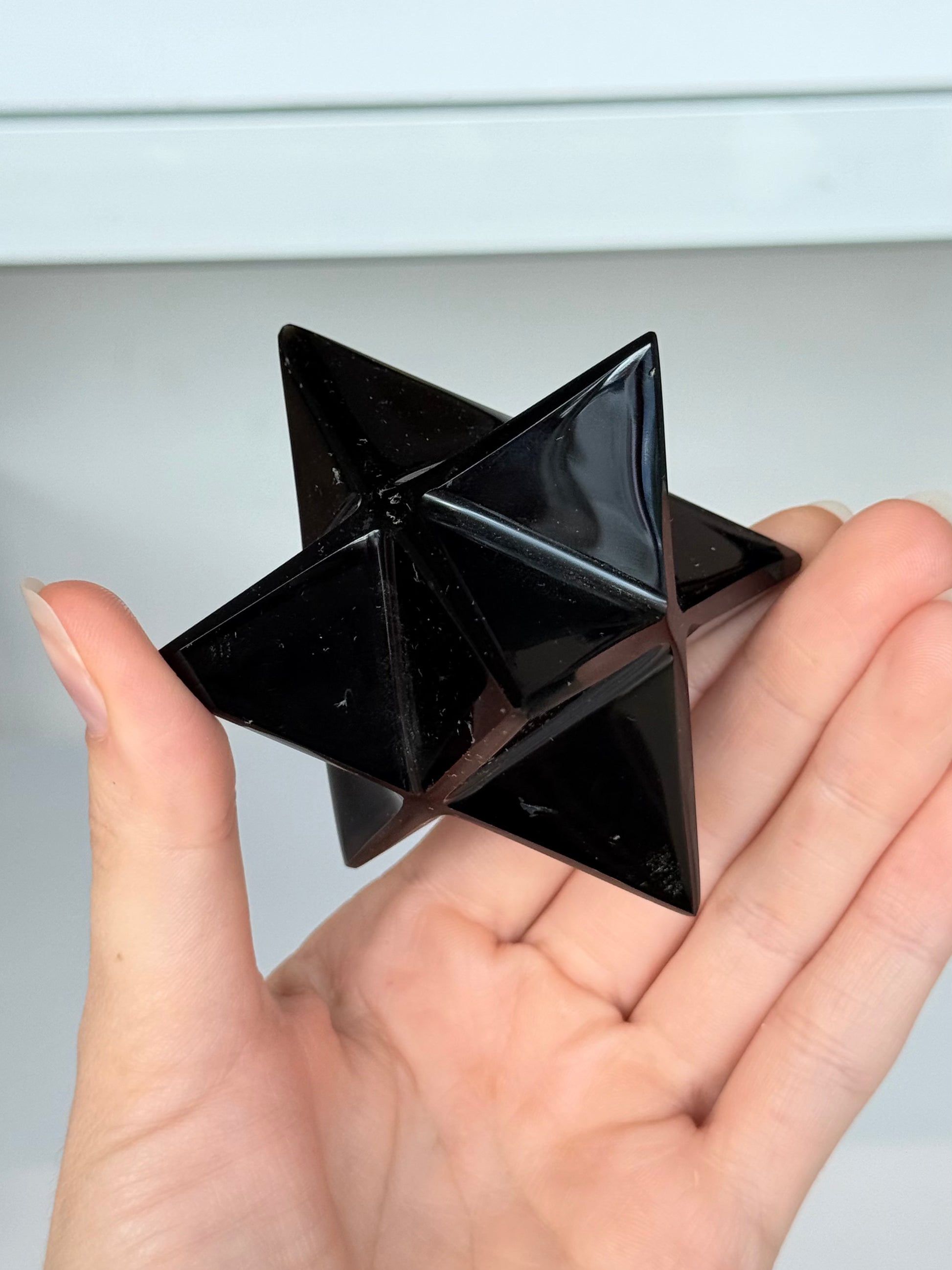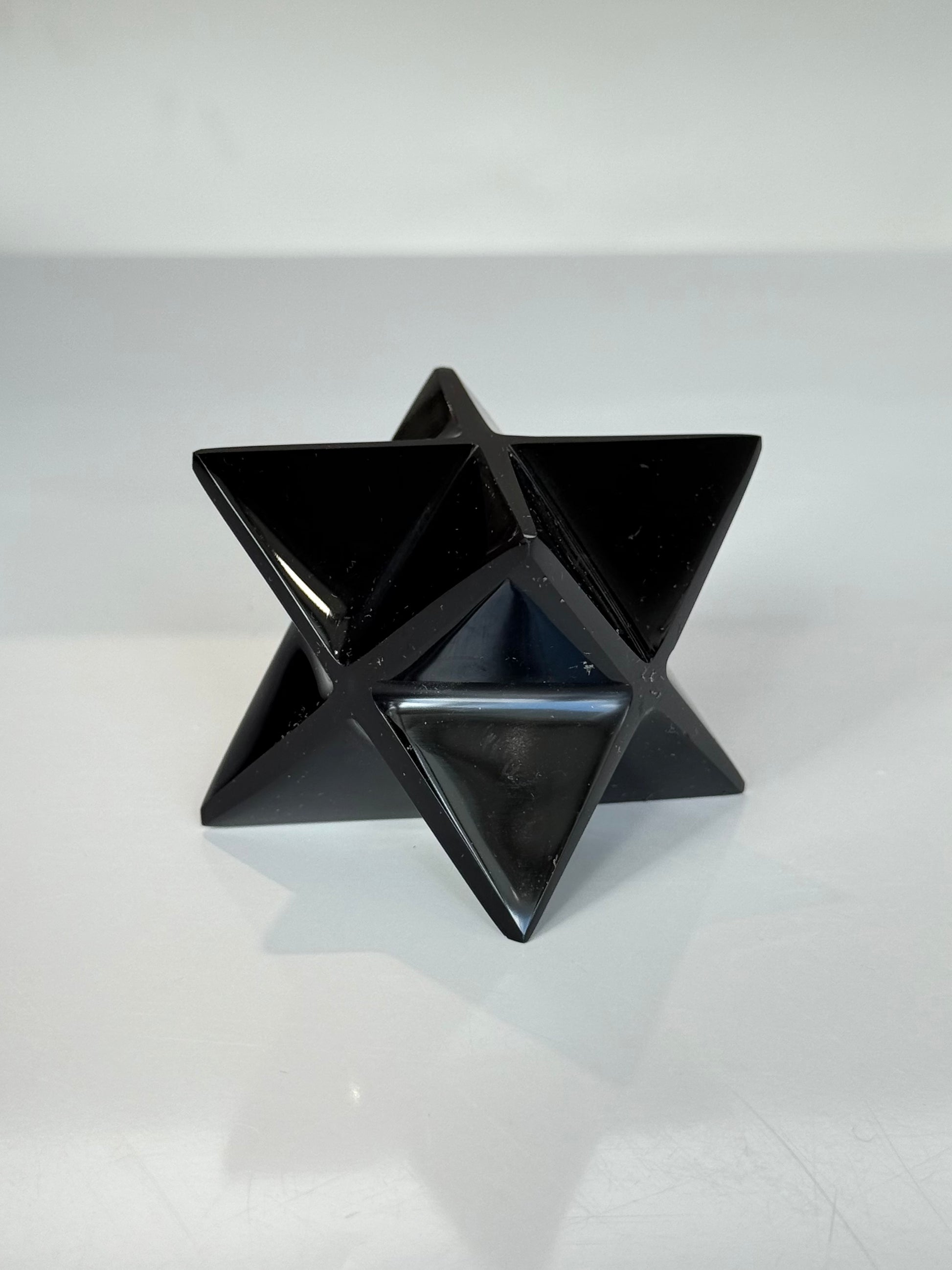 The Merkabah is a sacred geometric shape that represents the union of body, mind, and spirit. It acts as a vehicle for spiritual balance and energetic alignment. When combined with Black Obsidian, the Merkabah form grounds higher energies into the physical body while maintaining protection and stability.