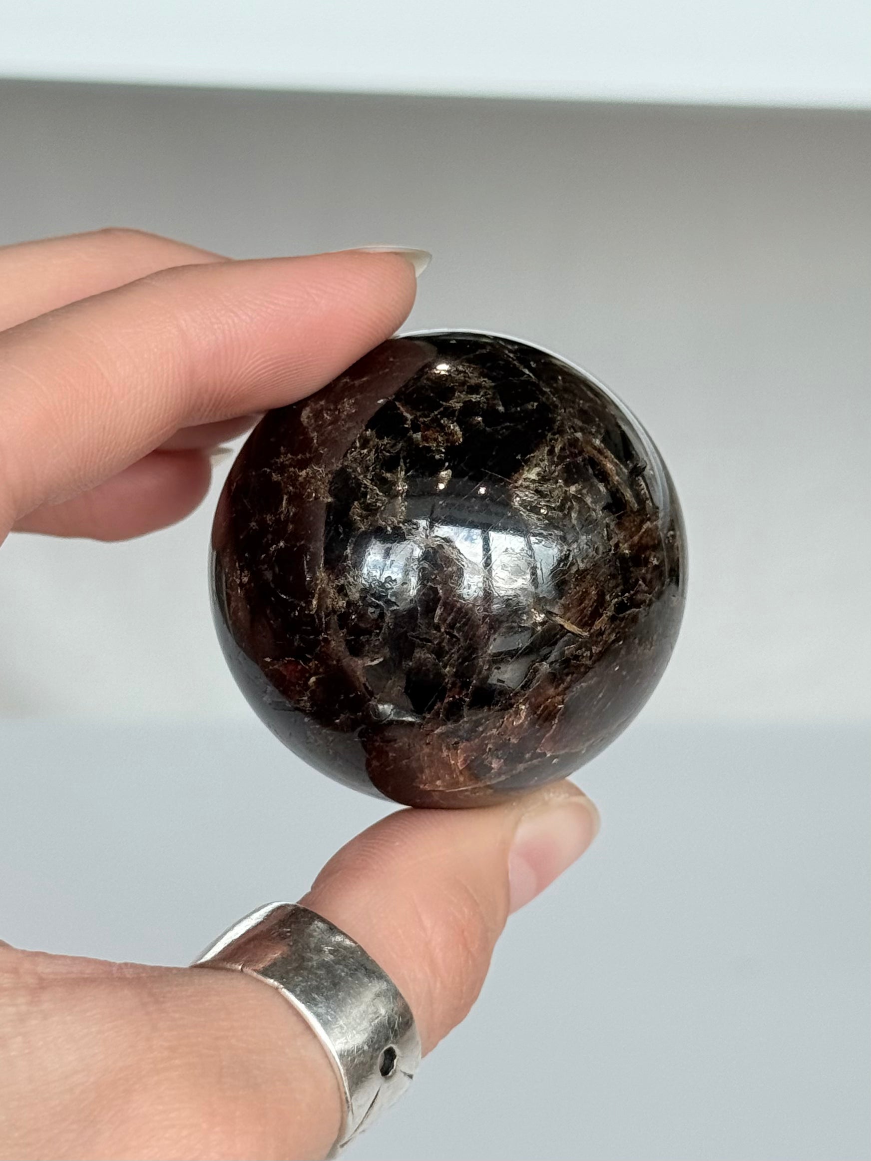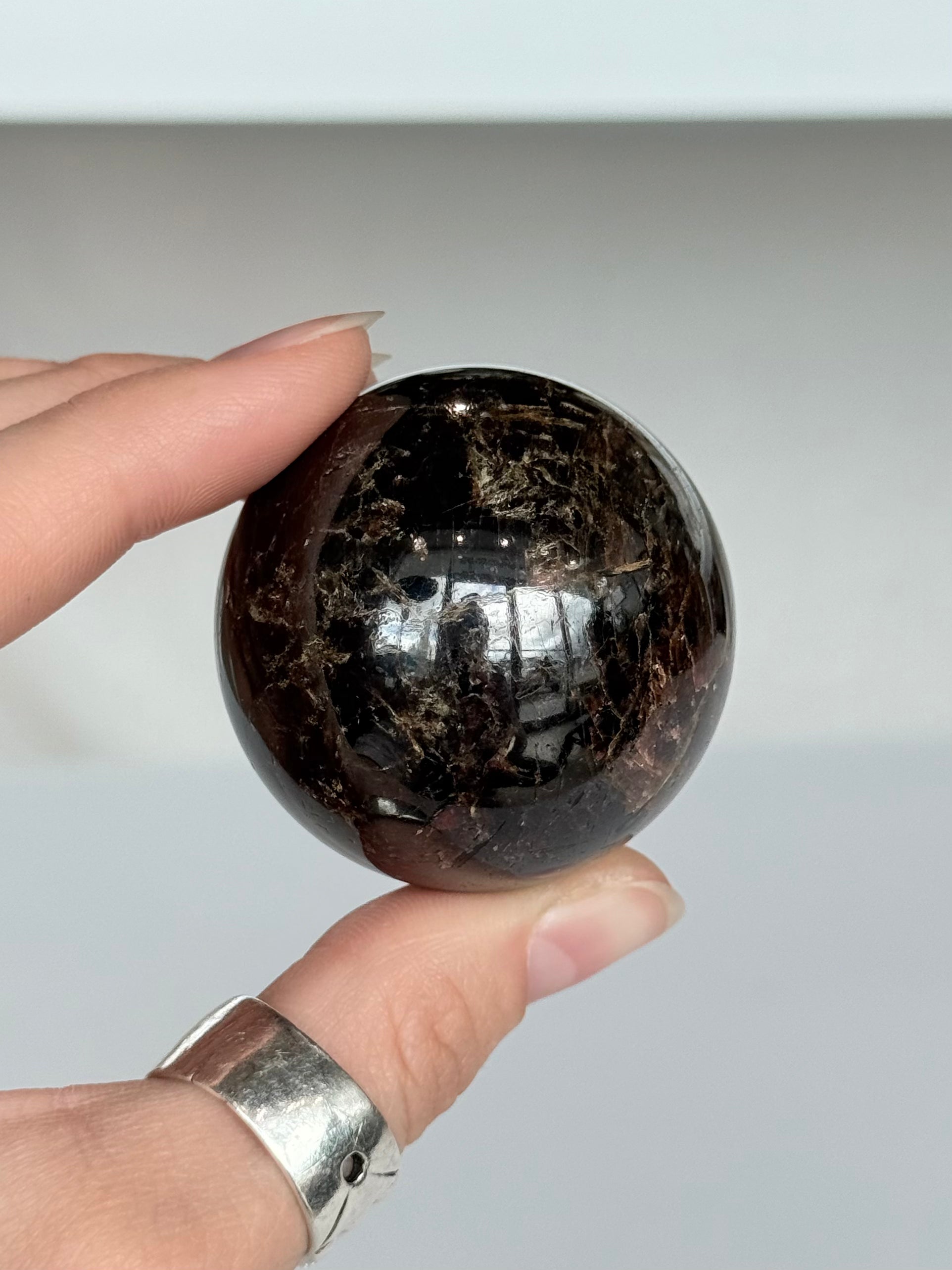 This Star Garnet Sphere features deep red to burgundy tones with a natural asterism effect that reveals a subtle star pattern under direct light. This rare optical phenomenon is created by internal mineral inclusions that reflect light in a star-like formation across the surface.