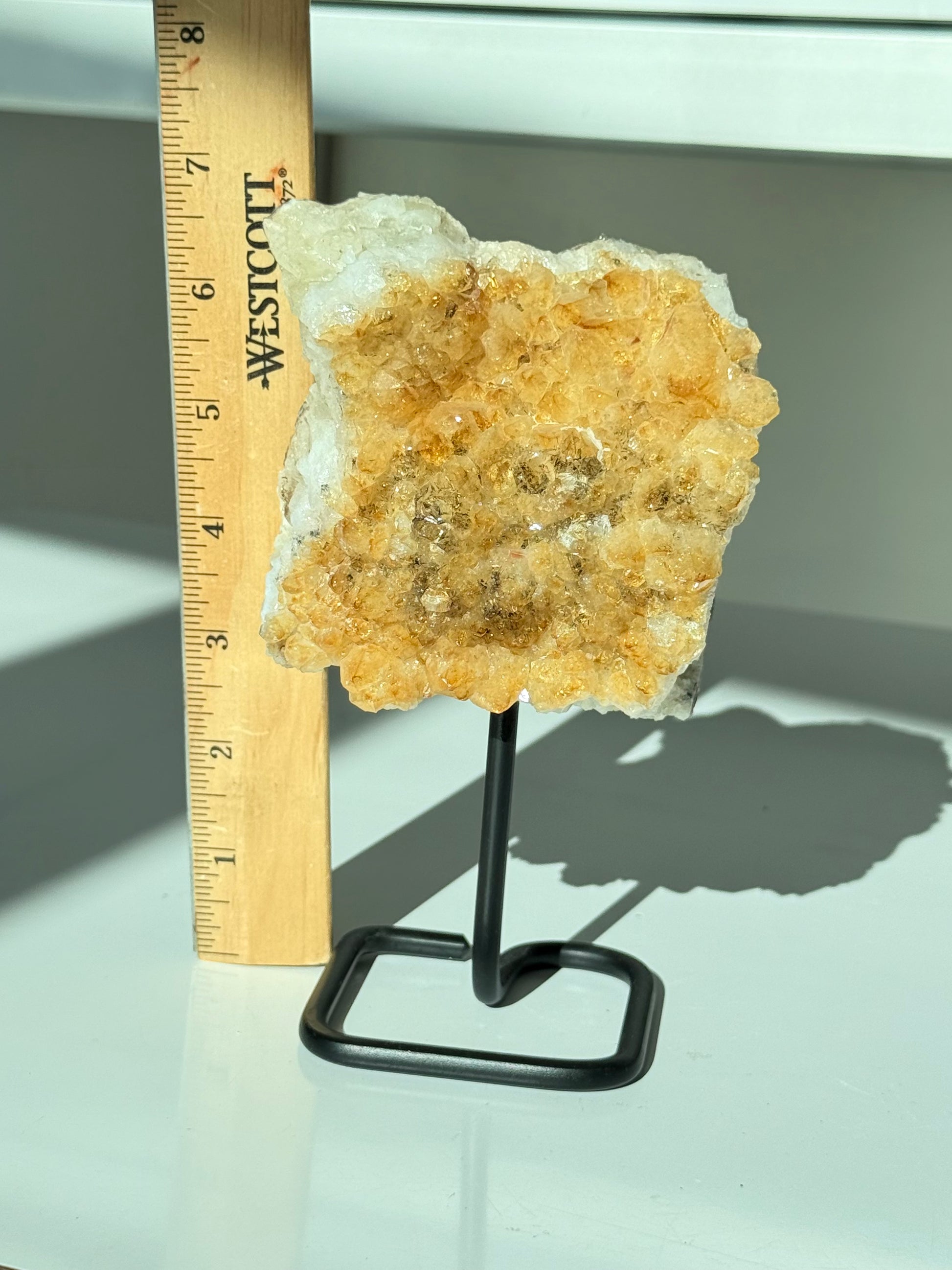 Citrine on Stand a statement piece that brings light, clarity, and expansion into your space. This natural citrine cluster features warm golden crystals and sits on a sleek black metal stand, making it perfect for your altar, desk, living room, entryway, or abundance corner.