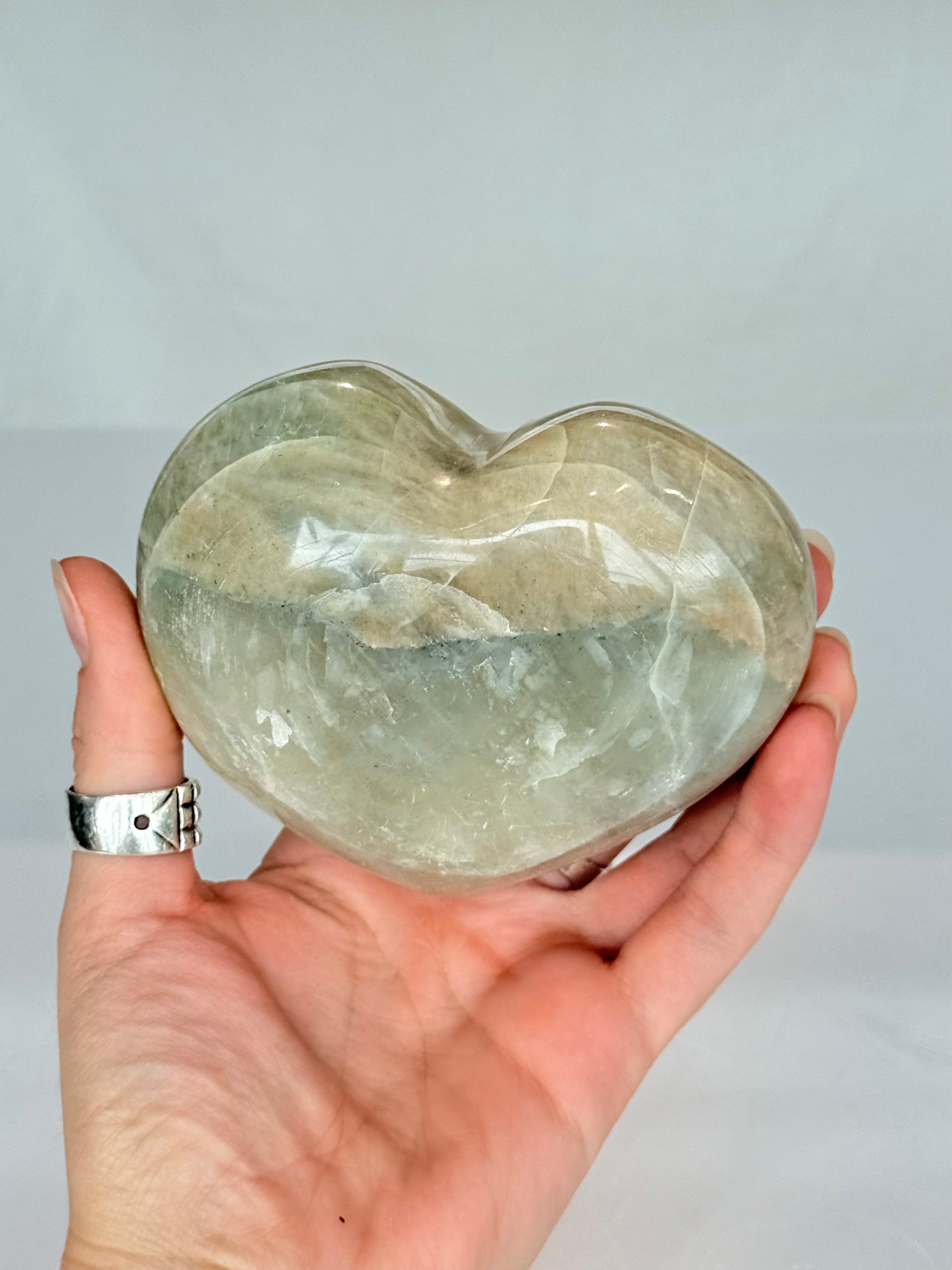 This Green Moonstone Heart from Madagascar features soft green tones with a subtle natural sheen that reflects its calming and intuitive nature. Madagascar is known for producing high-quality moonstone with gentle color variation and luminous depth.