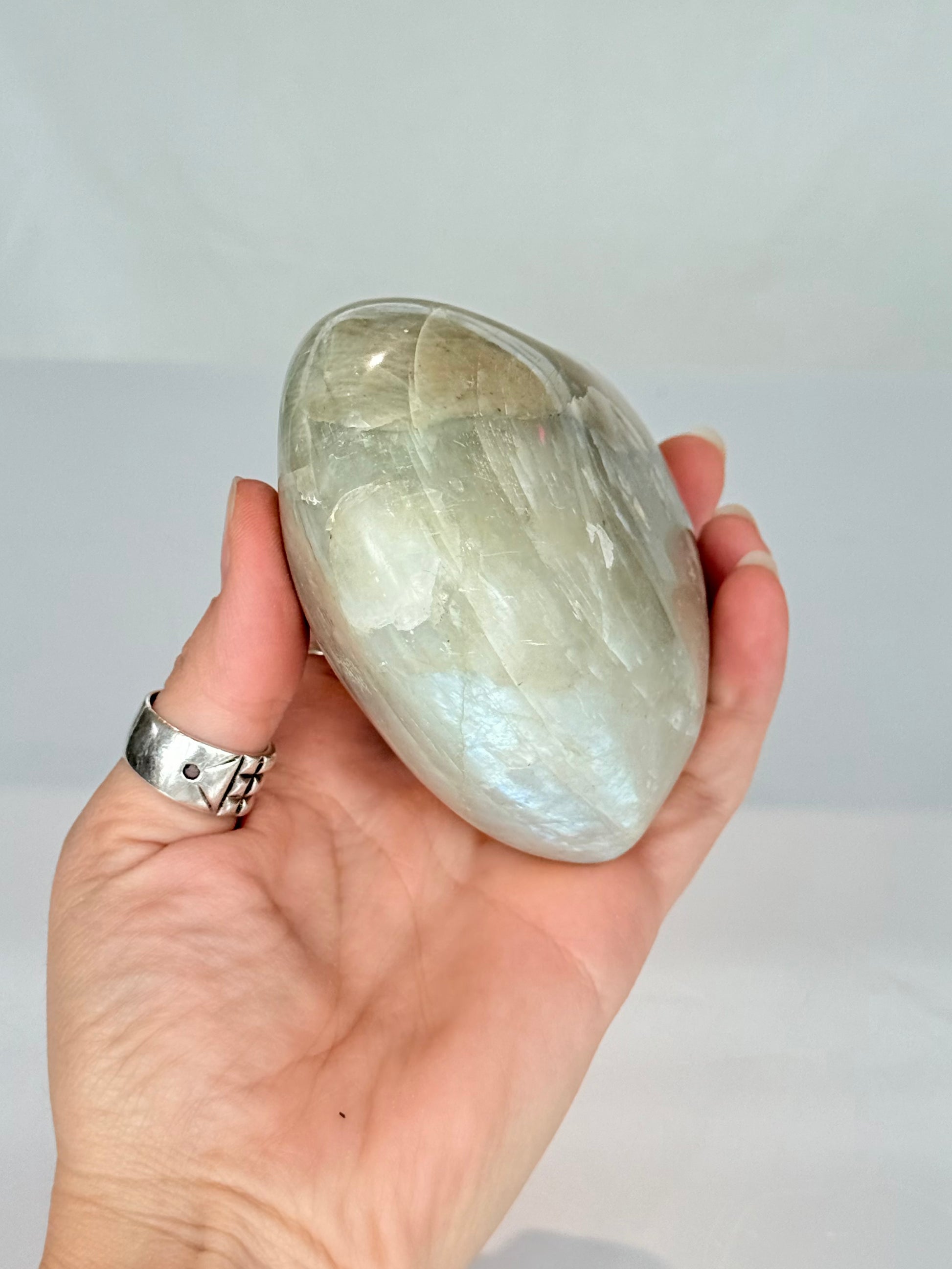Green Moonstone is associated with emotional balance, renewal, and inner growth. It supports heart-centered awareness while strengthening intuition and personal reflection. Its energy encourages calm decision-making and alignment with natural cycles.