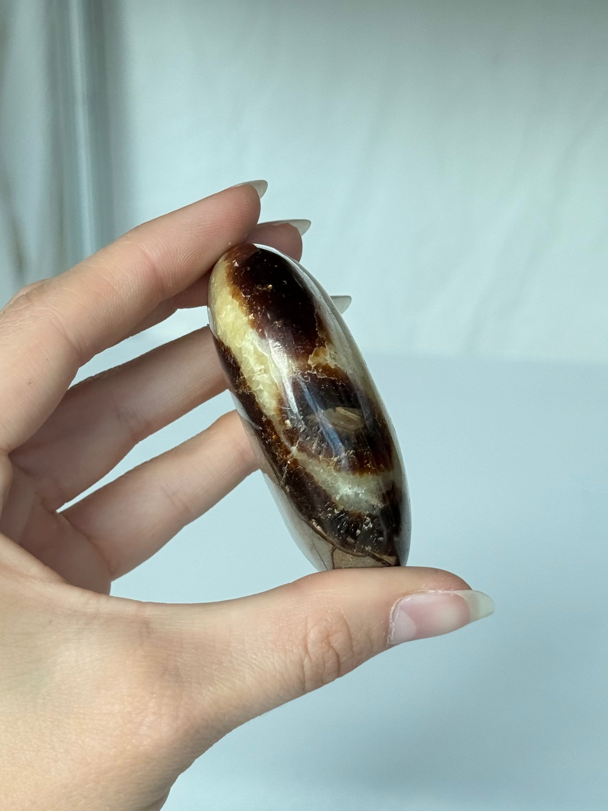 The Septarian Palm Stone is a unique geological formation known for its striking patterns and earthy tones. This stone enhance grounding and emotional balance, making it a valuable tool for meditation and spiritual practices. Its smooth, polished surface fits comfortably in the hand, promoting relaxation and stress relief. As a palm stone, it aids in channeling energy and fostering a deeper connection to the earth, supporting clarity and calmness in daily life. Ideal for both collectors and those seeking spiritual growth, the Septarian Palm Stone combines natural beauty with meaningful benefits.
